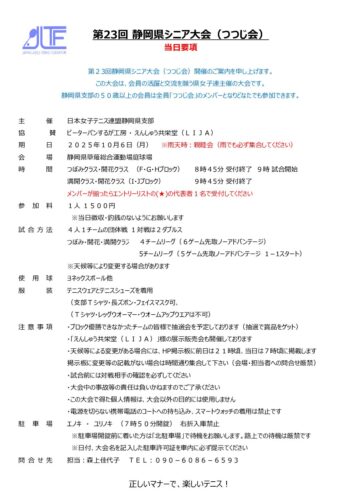 2025年度 県主催 第23回静岡県シニア大会(つつじ会) 2025 10/12 結果・写真をアップしました 開催日 2025年10月6日(月) - 予備日なし 締切日 2025年9月7日(日) 会場 静岡県草薙総合運動場庭球場 写真 写真を見る 募集要項 ダウンロード 当日要項 ダウンロード エントリーリスト ダウンロード ドロー ダウンロード 結果 ダウンロード