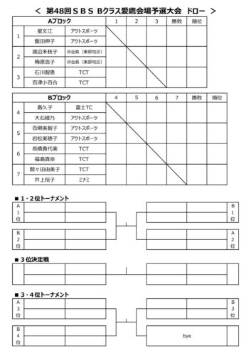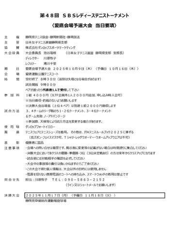 2025年度 県主催 第48回 SBSレディーステニストーナメント(Bクラス愛鷹会場予選) 2025 10/09 結果をアップしました 開催日 2025年10月9日(木) 予備日 2025年10月16日(木) 締切日 2025年9月14日(日) 会場 愛鷹運動公園テニスコート 募集要項 ダウンロード 当日要項 ダウンロード エントリーリスト ダウンロード ドロー ダウンロード 結果 ダウンロード