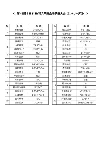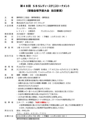 2025年度 県主催 第48回 SBSレディーステニストーナメント(Bクラス草薙会場予選) 2025 10/15 結果・写真をアップしました 開催日 2025年10月15日(水) 予備日 2025年10月30日(木) 締切日 2025年9月14日(日) 会場 静岡県草薙総合運動場庭球場 写真 写真を見る 募集要項 ダウンロード 当日要項 ダウンロード エントリーリスト ダウンロード ドロー ダウンロード 結果 ダウンロード
