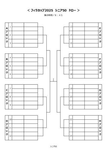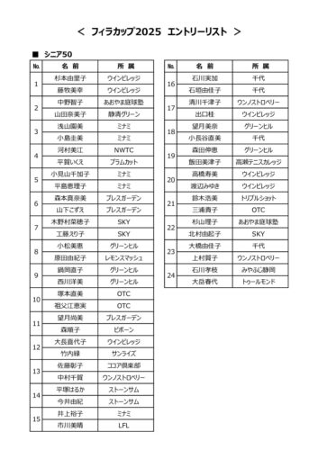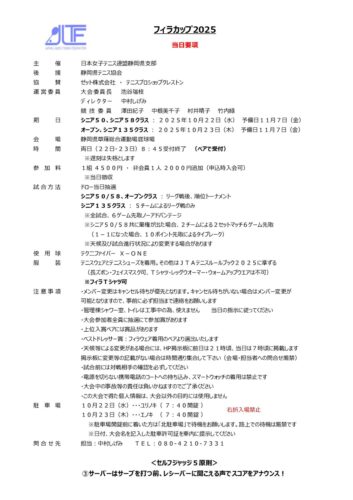 2025年度 県主催 フィラカップ2025 「シニア50」「シニア58」 2025 10/11 当日要項・空ドローをアップしました 開催日 2025年10月22日(水) 予備日 2025年11月7日(金) 締切日 2025年9月20日(土) 会場 静岡県草薙総合運動場庭球場 募集要項 ダウンロード 当日要項 ダウンロード エントリーリスト ダウンロード ドロー ダウンロード