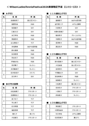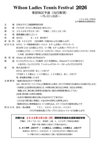 2026年度 県主催 Wilson Ladies Tennis Festival 2026(東部地区予選) 2026 1/16 当日要項・空ドローをアップしました 開催日 2026年2月5日(木) 予備日 2026年2月12日(木) 締切日 2026年1月5日(月) 会場 愛鷹運動公園テニスコート 募集要項 ダウンロード 当日要項 ダウンロード エントリーリスト ダウンロード ドロー ダウンロード