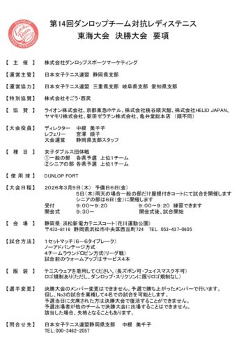 2026年度 県外主催 第14回ダンロップチーム対抗レディステニス東海大会決勝大会(静岡県) 2026 1/07 募集要項をアップしました 開催日 2026年3月5日(木) 予備日 2026年3月6日(金) 締切日 2026年2月9日(月) 会場 浜松新電力テニスコート(花川運動公園) 募集要項 ダウンロード