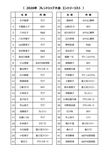 2026年度 東部地区 フレンドシップ大会in東部 2026 2026 2/24 エントリーリストをアップしました 開催日 2026年3月12日(木) - 予備日なし 締切日 2026年2月23日(月) 会場 愛鷹運動公園テニスコート 募集要項 ダウンロード エントリーリスト ダウンロード