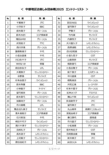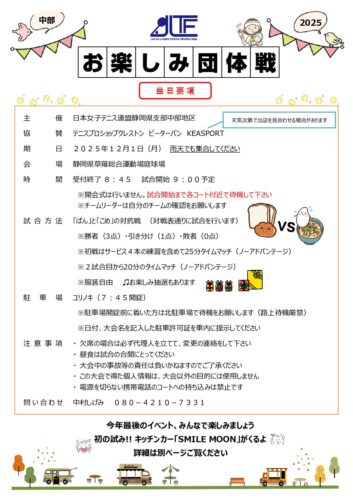 2025年度 中部地区 中部地区お楽しみ団体戦2025 2025 12/01 結果・写真をアップしました 開催日 2025年12月1日(月) - 予備日なし 締切日 2025年10月28日(火) 会場 静岡県草薙総合運動場庭球場 写真 写真を見る 募集要項 ダウンロード 当日要項 ダウンロード エントリーリスト ダウンロード ドロー ダウンロード 結果 ダウンロード キッチンカー事前予約 ダウンロード
