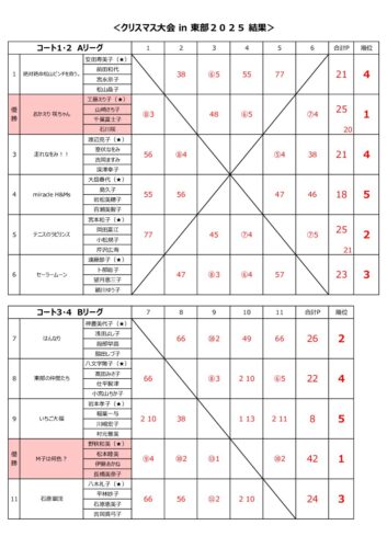 2025年度 東部地区 女子連クリスマス大会in東部 2025 2025 12/13 結果・写真をアップしました 開催日 2025年12月11日(木) 予備日 2025年12月18日(木) 締切日 2025年11月10日(月) 会場 愛鷹運動公園テニスコート 写真 写真を見る 募集要項 ダウンロード 当日要項 ダウンロード エントリーリスト ダウンロード ドロー ダウンロード 結果 ダウンロード