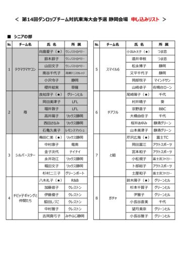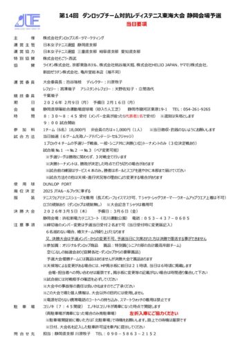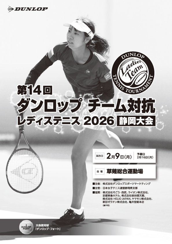 2026年度 県主催 第14回ダンロップチーム対抗レディステニス東海大会予選(静岡会場) 2026 2/10 結果・写真ををアップしました スポンサー広告 開催日 2026年2月9日(月) 予備日 2026年2月16日(月) 締切日 2026年1月7日(水) 会場 静岡県草薙総合運動場庭球場 写真 写真を見る 募集要項 ダウンロード 当日要項 ダウンロード エントリーリスト ダウンロード ドロー ダウンロード 結果 ダウンロード シニア申し込みリスト ダウンロード 記念Tシャツ販売 ダウンロード