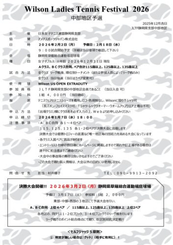 2026年度 県主催 Wilson Ladies Tennis Festival 2026(中部地区予選) 2025 12/02 募集要項をアップしました。 開催日 2026年2月2日(月) 予備日 2026年2月18日(水) 締切日 2026年1月7日(水) 会場 静岡県草薙総合運動場庭球場 この大会に申し込む 募集要項 ダウンロード