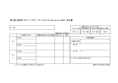 2026年度 県外主催 第18回会長杯グリーン・ヴィーチームテニス with prince 2026(広島県) 2026 2/10 募集要項をアップしました ※申込期間:4月7日(火)9:00 〜 4月14日(火)17:00 郵送のみ・先着順 大会申込書(Excel版)はこちらからダウンロードできます 開催日 2026年6月16日(火) - ~6/17(水) 締切日 2026年4月14日(火) 会場 こざかなくんスポーツパークびんご スマッシュこざかなくんテニスコート(砂入り人工芝) 募集要項 ダウンロード 大会申込書(PDF) ダウンロード