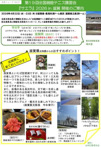 2026年度 県外主催 第19回全国親睦テニス講習会「サエラ」2026(滋賀県) 2026 2/13 募集要項・大会ニュースをアップしました 申し込みは各自直接お願いします 開催日 2026年4月22日(水) - ~4/23(木) 締切日 2026年4月3日(金) 会場 県民共済ドーム長浜(滋賀県立長浜ドーム) 募集要項 ダウンロード 大会ニュース ダウンロード