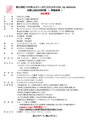 2026年度 県主催 第23回 ピンクリボンレディーステニスフェスティバル by Admiral お楽しみ団体戦~草薙会場~ 2026 4/24 当日要項をアップしました 開催日 2026年5月11日(月) 予備日 2026年5月28日(木) 締切日 2026年4月13日(月) 会場 静岡県草薙総合運動場庭球場 募集要項 ダウンロード 当日要項 ダウンロード エントリーリスト ダウンロード ピンクリボンTシャツ ダウンロード