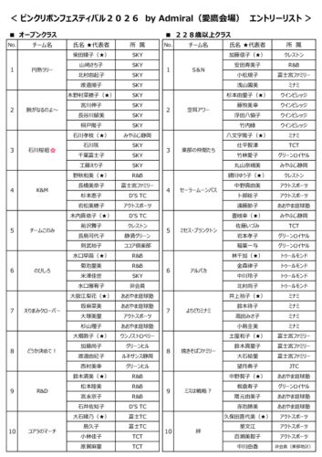 2026年度 県主催 第23回 ピンクリボンレディーステニスフェスティバル by Admiral お楽しみ団体戦~愛鷹会場~ 2026 4/12 エントリーリストをアップしました ※ 愛鷹、草薙、花川どの会場でもエントリー出来ます。複数会場にエントリーしてもOKです! ピンクリボンTシャツはお知らせ一覧の「ピンクリボン記念Tシャツの申し込みについて」の所から申し込みが出来ます 開催日 2026年5月14日(木) 予備日 2026年5月21日(木) 締切日 2026年4月11日(土) 会場 愛鷹運動公園テニスコート 募集要項 ダウンロード エントリーリスト ダウンロード ピンクリボンTシャツ ダウンロード