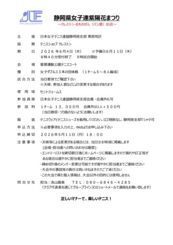 2026年度 東部地区 静岡県女子連紫陽花まつり 2026 2026 4/18 募集要項をアップしました 開催日 2026年6月4日(木) 予備日 2026年6月11日(木) 締切日 2026年5月11日(月) 会場 愛鷹運動公園テニスコート この大会に申し込む 募集要項 ダウンロード